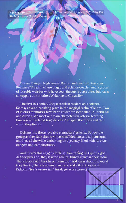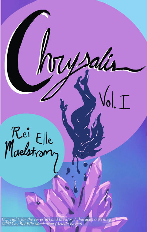 Chrysalis is a novel series, presently being worked on by author Rei Elle Maelstrom. I am currently working on the audio book. If you would like to volunteer for the vocal work, to gain experience/ media to add to your personal portfolio, reach out via one of the social links. Please contact us if you would like to help. All "beta testers" will be referred to on a gratitude page on all published books for purchase.The purpose of this site is to casually advertise Maelstrom's newly published novel "Chrysalis". If you have questions or comments, please see the social media links at the top of this site page for contact methods.This is a work of fiction. All content in this book and other related works created by the author, including but not limited to: the names, characters, businesses, places, events and incidents, etc... are either the product of the author's imagination or used in a fictitious manner. Any resemblance to actual persons, living or dead, or actual events is purely coincidental.Chrysalis was fully created, written, and is owned by author Rei Elle Maelstrom (aka Arielle Payne). Please also be aware of possible triggers in the series. Trigger warnings include: brief mention of alcohol, mention of suicidal ideation/ attempt, use of curse words, violence/ mention of blood/ injury, reference to sexual assault and PTSD, loss of loved one, mental pain/ disorders...